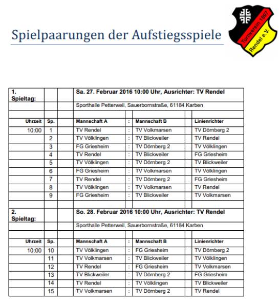 Am 27. und 28. richtet der TV Rendel in der Petterweiler Sporthalle die Aufstiegsspiele zur 2.Bundesliga aus. Zu diesem Großereignis reisen die beiden Erstplatzierten Männermannschaften aus den unterschiedlichen Landesverbänden in die Gemeinde Karben, um den Aufstieg in die zweithöchste deutsche Spielklasse zu realisieren.