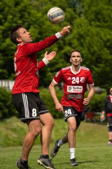 In der ersten Begegnung gegen die FG Griesheim fanden die Wetterauer zu Beginn nicht in ihr Spiel. Der starke Wind machte einen kontrollierten Spielaufbau schwierig und die Rendeler kamen zu Beginn deutlich schlechter als die Gäste mit den Bedingungen zurecht. Nachdem die beiden ersten Sätze mit 6:11 und 9:11 Punkten verloren gingen, kämpfte sich die Mannschaft angeführt von den Angaben von Hauptangreifer Jonas Knieß mit einem Satzergebnis von 11:9 zurück in die Partie. In der Folge konnte sich die Mannschaft auch dank sehenswerter Abwehraktionen von Janni Tille und Marian Horn, sowie Simeon Wittich ebenfalls mit 11:9 den vierten Satz sichern und erzwangen so den Entscheidungssatz. In diesem lag die Mannschaft um Kapitän Max Illner zum Seitenwechsel in Führung, verpasste es aber den Deckel auf die Partie zu machen und musste schlussendlich den Satz mit 8:11 Punkten und somit das Spiel verloren geben.