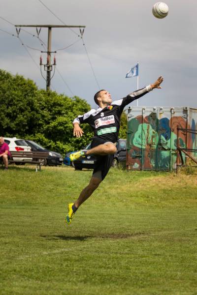 Kurz vor Spielbeginn begann es jedoch zu Gewittern, sodass die erste Partie zwischen den Dieburgern und der M1 mit einer leichten Verzögerung angepfiffen wurde. Die starken Regenfälle sorgten für einen sehr nassen Untergrund und ein dementsprechend schnelles Spiel. Nach einem umkämpften ersten Satz, bei dem es zu sehenswerten Abwehraktionen kam, setzte sich der TVR in der Satzverlängerung mit 13:11 durch. Aufgrund der guten Abwehr um die Abwehrspieler Jan-Niklas Tille und Sven Kletzin, gelang ein kontrollierter Spielaufbau, sodass die Rendler nun häufiger eine Lücke in der ebenfalls starken gegnerischen Abwehr finden konnten und den zweiten Satz mit 11:6 nach Hause zu bringen. Im dritten Satz verpasste es der TVR jedoch den Sack zu zumachen. Ein schwacher Start führte zu einem deutlichen 3:8 Rückstand. Trotz der starken Aufholjagd, welche durch den souverän aufspielenden Mittelmann Marian Horn angeführt wurde, musste man den Satz mit 8:11 an den TV Dieburg abgeben. Der vierte Satz brachte schlussendlich die Entscheidung, durch eine kämpferisch sehr ansprechende Leistung und das starke Überspiel der beiden Angreifer Luis Zang und Marvin Dunkel führte zum 12:10 Punktestand und dem 3:1 Sieg.