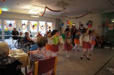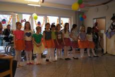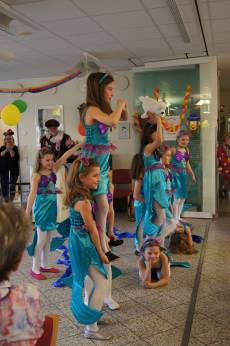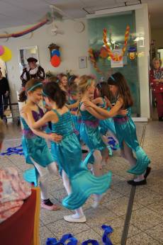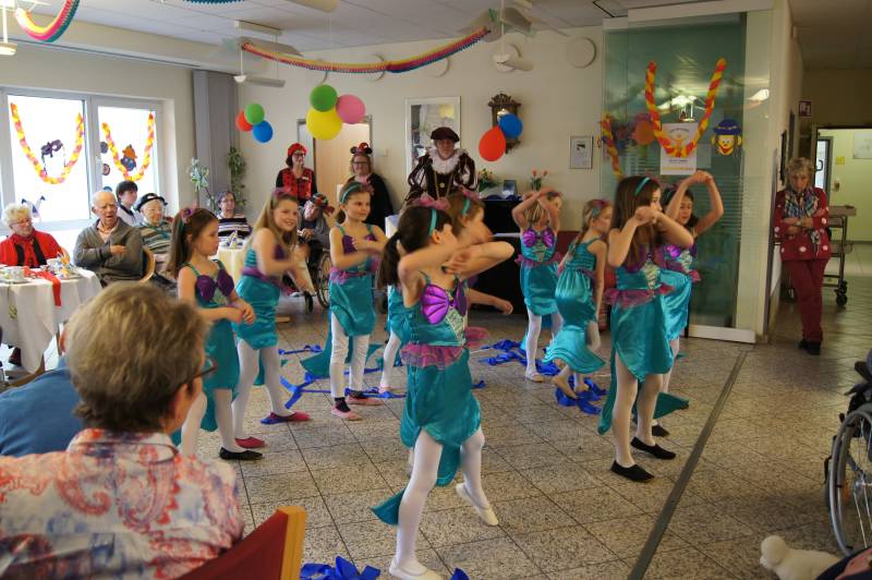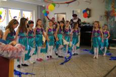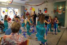 Als erstes präsentierten sie ihren Tanz zu dem Lied "Unter dem Meer" aus dem Film Arielle. Verkleidet als kleine Meerjungfrauen tanzten sie durch den Saal und sorgten für gute Stimmung! Mit blauen Gymnastikbändern wurden Wasser und Wellen dargestellt. Nach einer kurzen Umkleidepause gaben sie auch noch einen Tanz zu dem Lied "Zumba He Zumba Ha" zum Besten. Sichtlich erfreut über das bunte Treiben im Haus, klatschten die Heimbewohner mit. Glücklich über den gelungenen Auftritt und ein kleines Geschenk als Dankeschön, ging es dann für die Ice Angels wieder nach Hause.