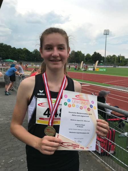 Nervosität? Keine Spur! Bei den Titelkämpfen in der Halle zu Beginn des Jahres krankheitsgeschwächt noch durchgereicht, ging Johanna (als jüngste Starterin des Feldes) das 800m-Rennen in Fulda von Anfang an offensiv und sehr mutig an und gleich an die Spitze. Dort konnte sie Tempo und Mitstreiterinnen kontrollieren. Und zwar so erfolgreich, dass sie sich eingangs der Zielgeraden immer noch in Führung befand – ein gefundenes Fressen für die auf den letzten 100 Metern schwer zu schlagende Johanna, die tatsächlich den Vorsprung ins Ziel retten und in neuer persönlicher Bestzeit von 2:20,27 min. – eine absolute nationale Topzeit für ihr Alter – nach einem gleichermaßen überragenden wie überraschenden Rennen zu ihrem ersten Hessenmeistertitel stürmen konnte.