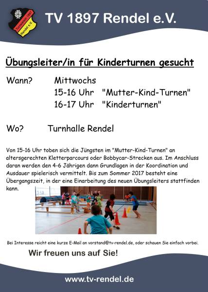 Die Abteilung Kinderturnen sucht nach einem neuen Trainer/in für die Kinderturngruppe (4-6 Jahre) am Mittwoch von 16.00 - 17.00 Uhr in der Turnhalle in Rendel.